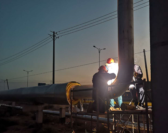 熱力管網一期項目位于蘭州新區綠色化工園區南區塊,由蘭州新區化學工程有限公司承建,主要負責為園區企業提供生產所需的蒸汽及采暖所需的熱水。該項目主管網已于2019年11月全線貫通,并投入使用。后期因新入園企業的增加,導致原管線預留口及企業門頭桁架發生變更需改遷。為了不影響園區企業生產運營,石投集團經過多方協調,商定于9月29日早上七點停汽。此次熱力管網管道改遷工作任務緊,難度大,工程公司迎難而上,通過前期對圖紙的精研,科學組織,精準施策,經過15個小時連續奮戰,最終完成6座企業門頭桁架蒸汽管道的改遷、6處新增蒸汽預留接口的安裝及2處DN400旋轉補償器位置的變更。